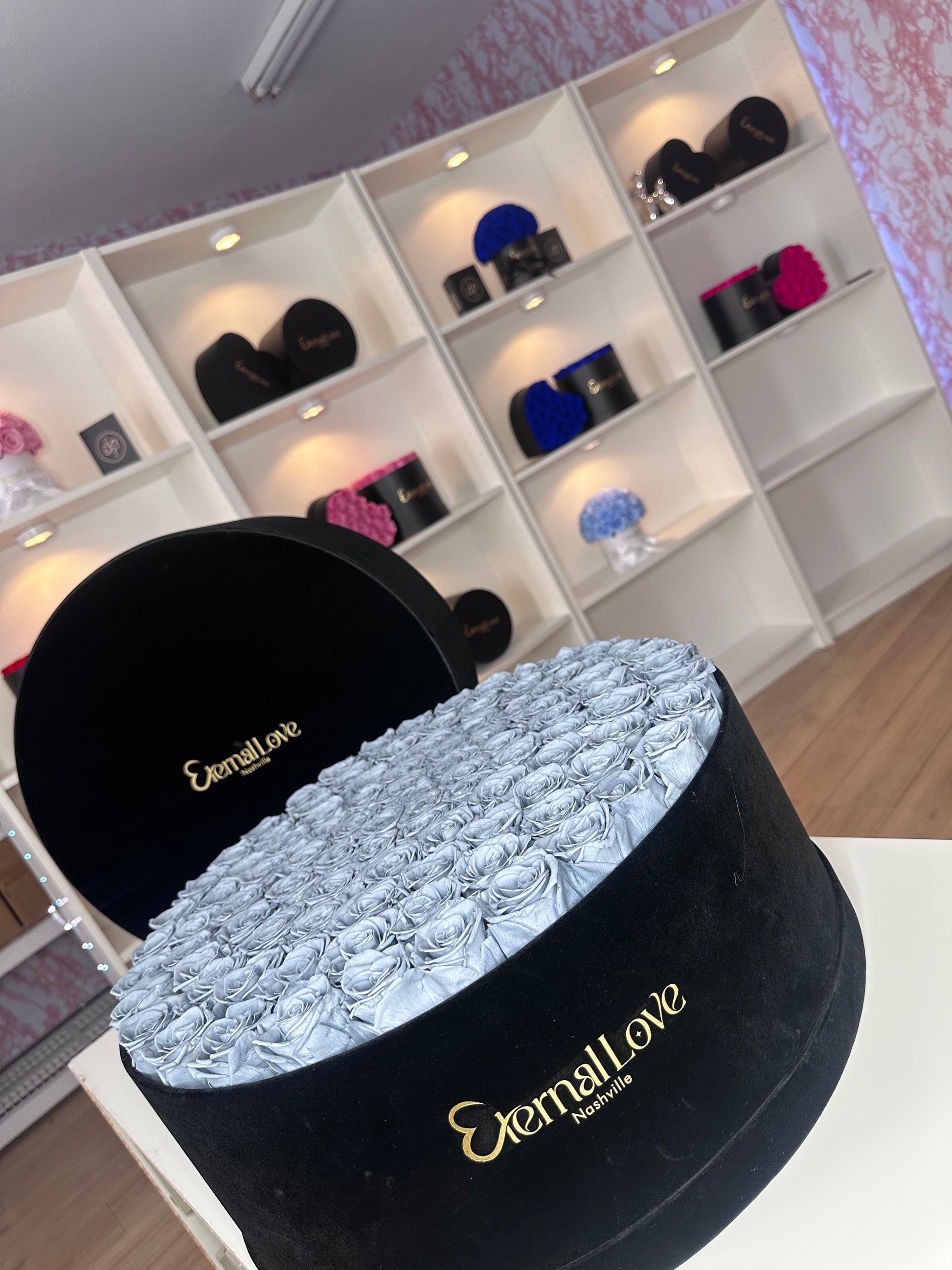 Make a Bold and Unforgettable statement with our luxurious round box of preserved roses. Hand-selected for perfection and elegance, each rose is meticulously arranged in a matte black round box adorned with gold Eternal Love Nashville branding. This arrangement is designed to last a year or longer with no maintenance required—symbolizing timeless love, deep devotion, or powerful admiration.